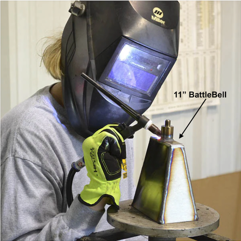 Once cut, our sides are TIG welded into a solid body. The Bell being welded is an original 11" BattleBell!