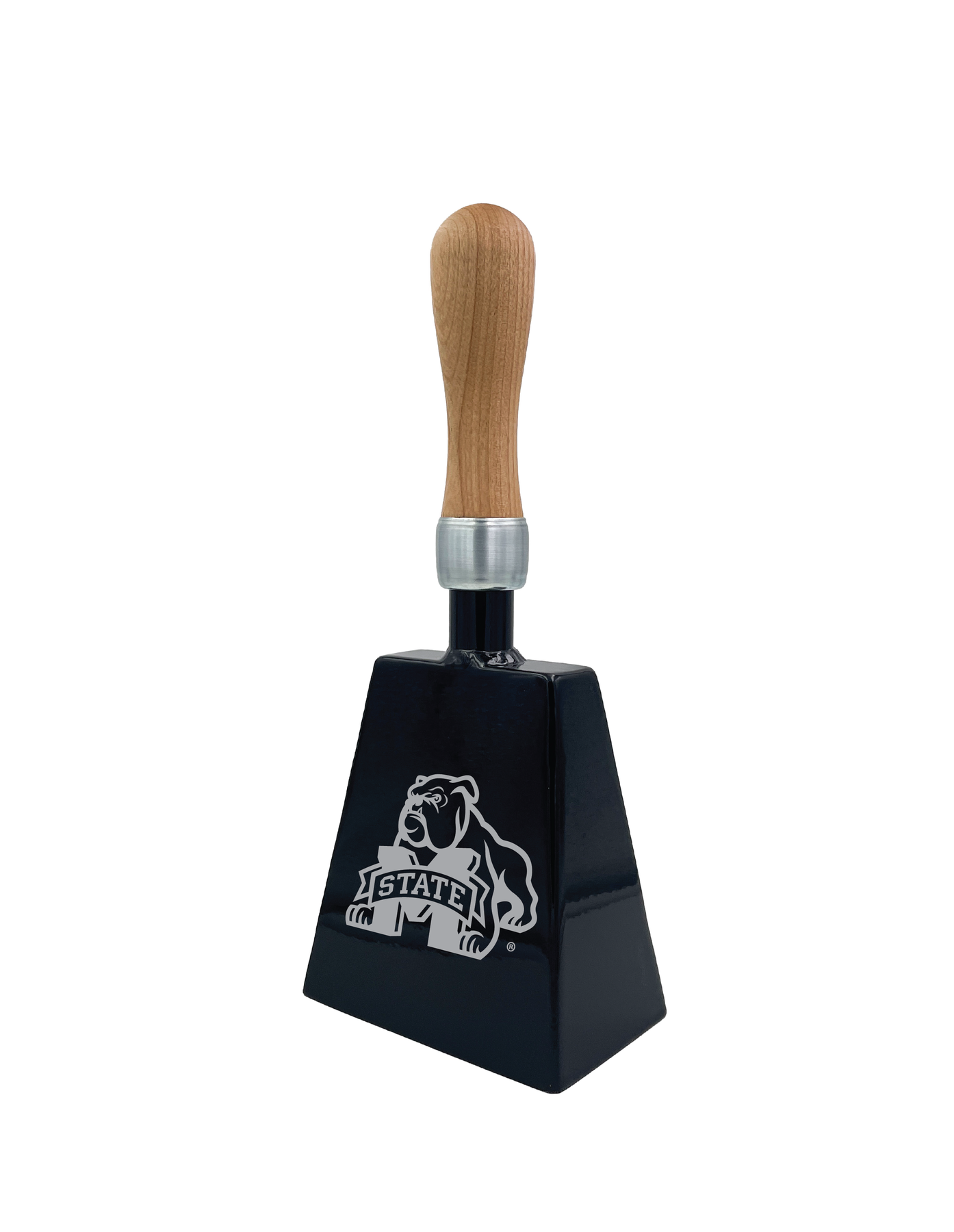 This is an officially licensed cowbell for Mississippi State University. This particular bell offers the classic MSU Bulldog trademark laser engraved into our 16 gauge stainless steel.